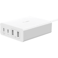 Laad je laptop, smartphone, oordopjes en smartwatch tegelijk op met de Belkin Power Delivery Power Hub met 4 Usb Poorten 96W Wit. Handig als je weinig stopcontacten in de buurt hebt en meerdere apparaten wil opladen. Met de eerste 2 usb A poorten laad je jouw oordopjes, smartwatch of koptelefoon op. De derde usb C poort levert 30 watt vermogen. Hiermee laad je jouw smartphone of tablet snel op. Alle iPhones vanaf iPhone 8 en de meeste nieuwe Android smartphones ondersteunen snelladen via Power Delivery. Je iPhone zit binnen een half uur al voor 50 procent weer vol. Met de laatste en krachtigste poort laad je jouw laptop op. Je krijgt geen oplaadkabels meegeleverd. Let goed op welke aansluitingen je nodig hebt.